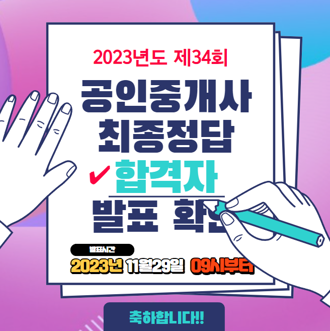 11월 29일 9시부턴 34회 공인중개사 합격자 발표 확인 / 최종 정답 조회가 가능한데요. 실질적으로 당일 합격자 발표 조회만 해보시면 됩니다. 함께 공개되는 점수 체크하시면 되고요. 이때 점수나 어떤 부분에 이상이 있으신 분만 최종정답 확인하셔서 가답안 채점했던 것과 비교하시면서 다시 체크해보시면 되겠습니다.