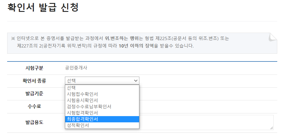 11월 29일 합격자 발표가 있은후 부터는 큐넷 공인중개사 홈페이지 통해서 각종 확인서 발급이 가능 합니다. 일반적으로 합격확인서를 많이 발급 하는데요. 그냥 합격확인서와 최종 합격확인서 차이는 아래와 같습니다.