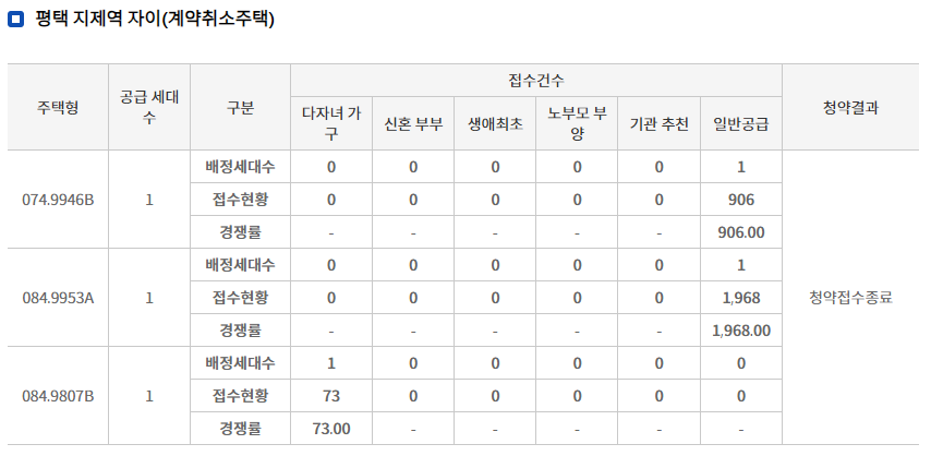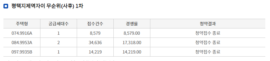 - 타입별 최고 경쟁률 ==> 84A타입 : 17,318대 1( 2명 모집에 34,636명접수)