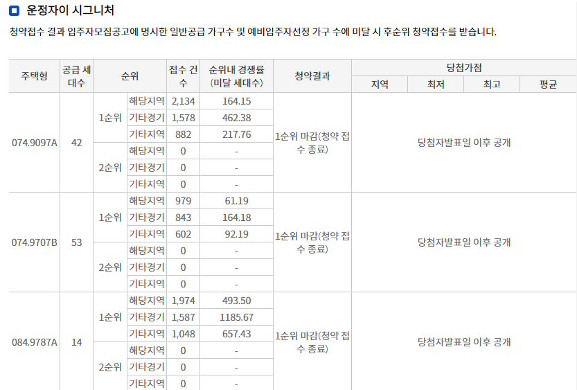 지난 23.6.5~6.8까지 청약 진행된 운정자이 시그니처 청약이 엄청난 경쟁률을 기록하며 모두 1순위 마감되었습니다. 정말 엄청난 역대급 경쟁률을 기록했습니다. 4만명이 넘는 청약 통장이 몰리면서 파주 주민은 다 청약한거 같다라는 이야기가 나올 정도입니다. 그럴만도 한게 84타입이 4억대인 희귀한 분양가 때문입니다. 서울 주민들까지 일단 넣고 보자 분위기 였던거 같습니다. 총 650가구 모집에 4만1802명이 신청을 했으니... 엄청나네요. 오는 6월 14일 00시부터 파주 운정자이 시그니처 당첨자 발표 조회가 가능한데요. 오늘 안내 참고하셔서 좋은 결과 얻으시기 바랍니다. 당첨후 정당계약 절차와 준비서류도 같이 안내해드립니다.