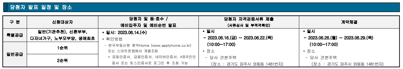 ㅇ 당첨자 발표 : 2023. 06. 14(수) 청약홈 에서 직접 조회