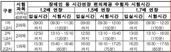 ㅇ 시간연장 편의제공 수험자 시험시간은 위에 표를 참고하시면 됩니다.(1.2배, 1.5배, 1.7배 연장)